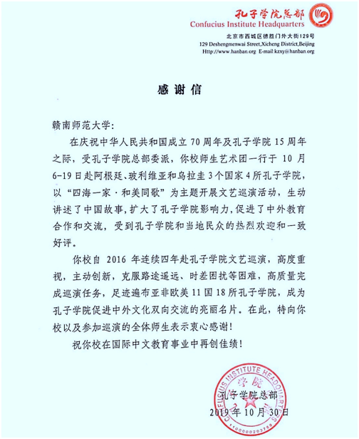 近日,孔子学院总部发来感谢信,祝贺我校2019年南美三国孔子学院文艺巡演取得圆满成功,对学校自2016年起连续四年赴亚非欧美11国18所孔子学院高质量完成巡演任务表示赞赏,称赞学校文艺巡演是促进中外文化双向交流的亮丽名片。